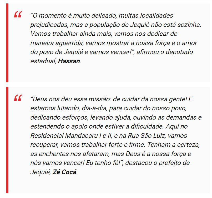 O prefeito de Jequié, Zé Cocá (PP), acompanhado do deputado eleito Hassan (PP) e alguns secretários municipais estiveram visitando as áreas atingidas pelas enchentes, conversando com os moradores desabrigados e prometendo apresentar soluções imediatas para sanar os problemas encontrados. Segundo vários moradores que reclamam e se manifestam em redes sociais, até hoje não o prefeito não cumpriu com suas promessas. A matéria jornalística produzida pela assessoria de comunicação da Prefeitura de Jequié, publicada no Site Oficial da Prefeitura, em 27 de dezembro, traz a seguinte mensagem do prefeito Zé Cocá e do Deputado Hasan: