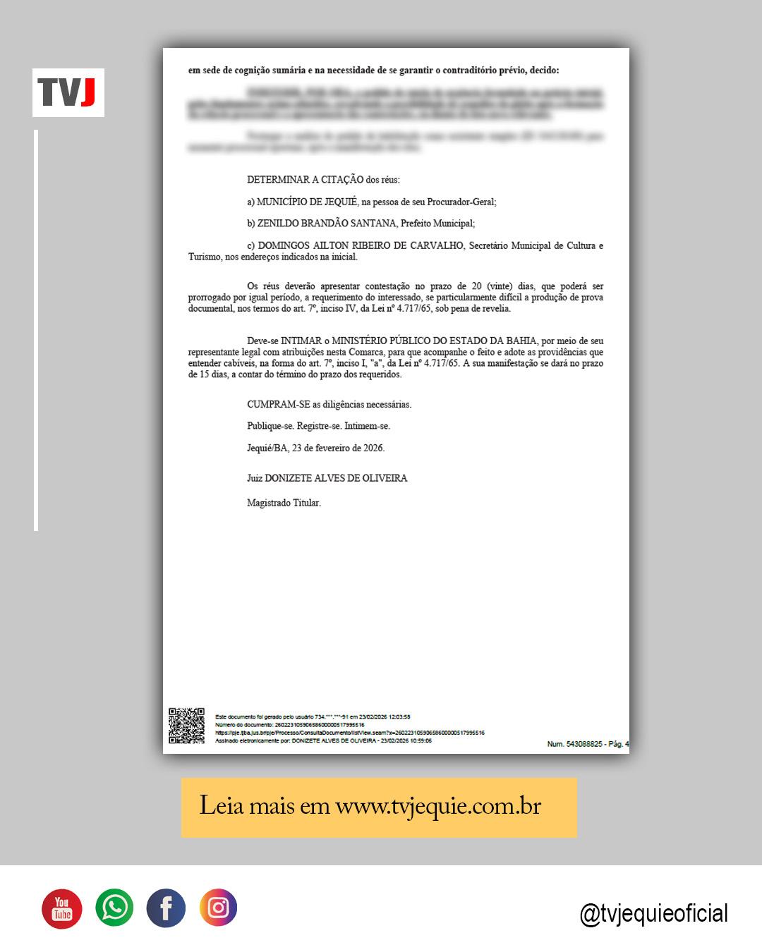 Na decisão preliminar, a Justiça, através do Juiz DONIZETE ALVES DE OLIVEIRA, determinou a citação dos réus: MUNICÍPIO DE JEQUIÉ, na pessoa de seu Procurador-Geral; ZENILDO BRANDÃO SANTANA, Prefeito e DOMINGOS AILTON RIBEIRO DE CARVALHO, Secretário Municipal de Cultura e Turismo, nos endereços indicados na inicial.