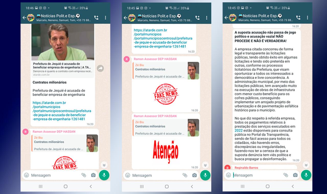 O assessor do Deputado Estadual Hassan Iossef (PP), Ramon Gonçalves, (SP 22), utilizou as redes sociais, através de grupo de whatsApp de Jequié, composto por 310 membros de diversos segmentos sociais e políticos, denominado “Notícias Políticos e Esportivo”, para afirmar que a reportagem do A Tarde, tendo como autor, o jornalista Rodrigo Tardio, como o título “Prefeitura de Jequié é acusada de beneficiar empresa de engenharia”, é uma FAKE NEWS.