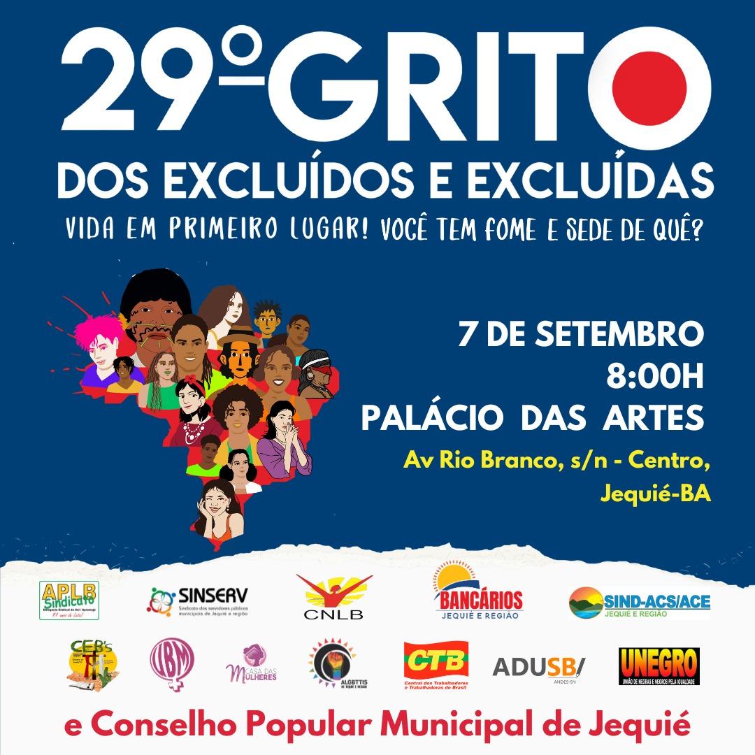 1) Data do 29º Grito dos/as Excluídos e Excluídas: 07-09-2023 (quinta-feira), com concentração às 08h00, em frente ao Palácio das Artes, Av. Rio Branco, S/N, Centro, Jequié;