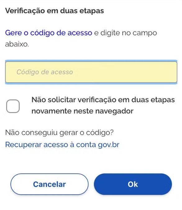 - Na tela em que o sistema pede o código da verificação em duas etapas, clique em “Recuperar acesso à conta gov.br”.
