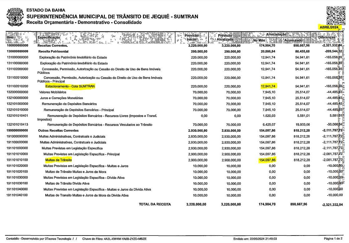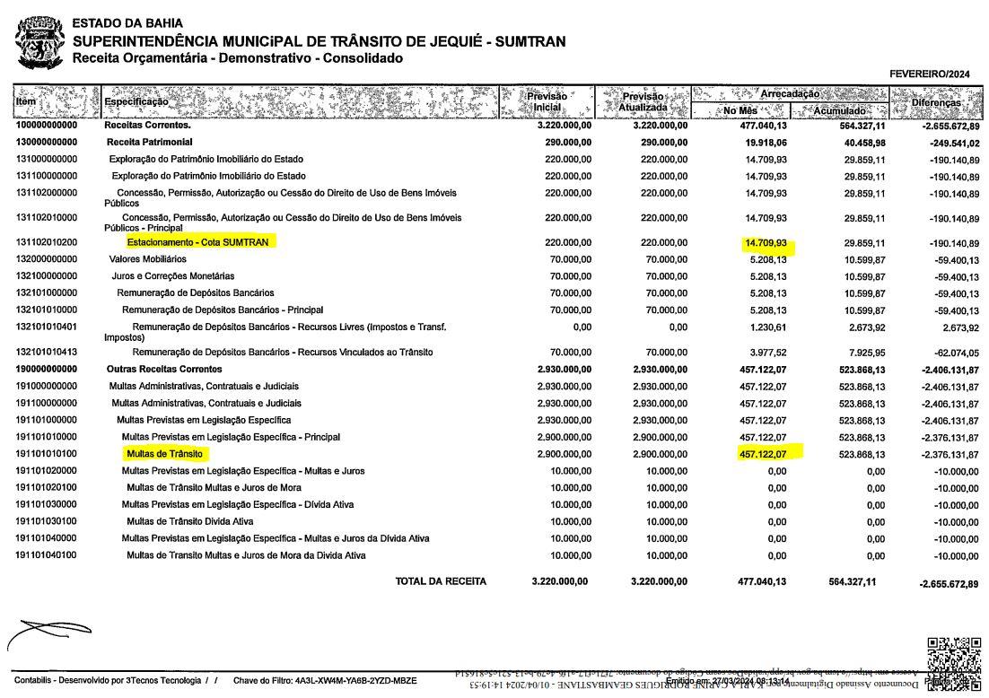 Com base na argumentação do vereador, os dados acostados no Tribunal de Contas da Bahia, registram que neste ano, em fevereiro, a Sumtran arrecadou R$ 457.122,07 somente com emissão de multas de trânsito e obteve ainda receita no valor de R$ 14.709,93 referente a cota devida ao município com estacionamento, repassada pela E-Parking, empresa que explora comercialmente a Zona Azul em Jequié