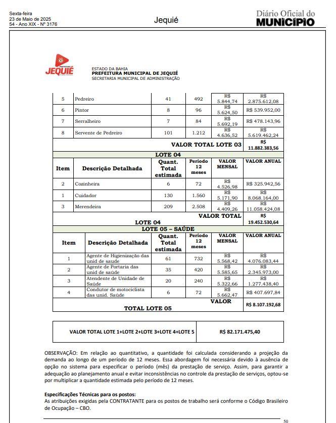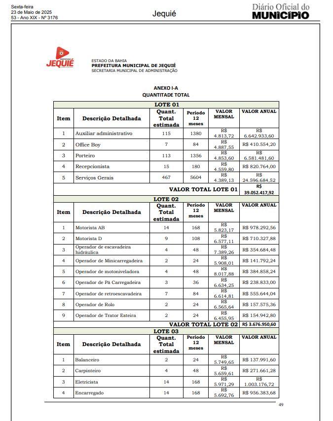 A prefeitura de Jequié lançou Edital de Licitação para contratação de empresa especializada em serviços de apoio operacional, para prestação de serviços de mão de obra e prestação de serviços continuados de apoio às atividades operacionais e administrativas, que irá atender as necessidades das diversas secretarias deste município de Jequié, pelo período de 12 (doze) meses.