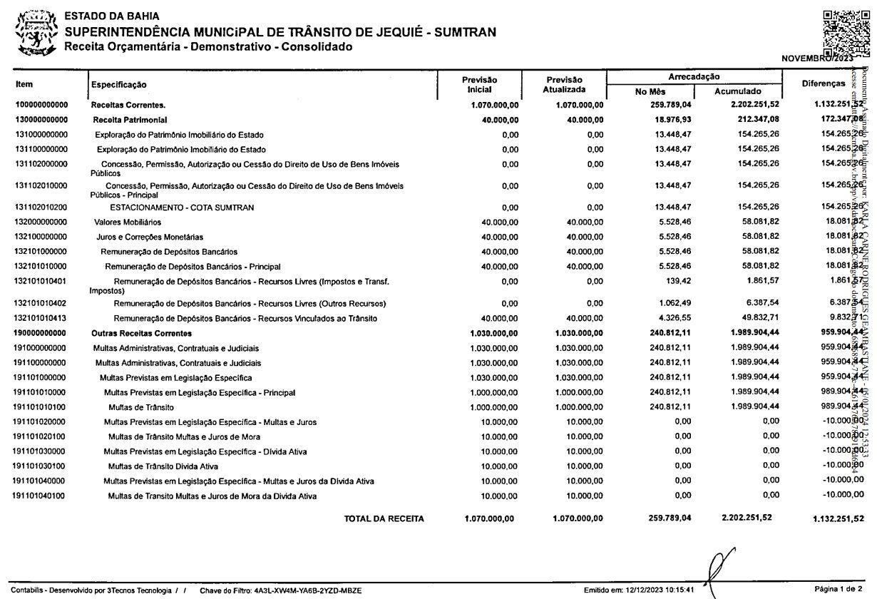 No Relatório sob a responsabilidade de Kleber Ramos de Jesus, Controlador Interno da Prefeitura de Jequié, no quesito RECEITA, chama a atenção o superávit de receita apontada com a arrecadação municipal no valor de R$ 240.812,11, somente no mês de novembro de 2023 com Multa de Trânsito, totalizando valor acumulado no ano de 2023, de R$ 1.989.904,44, sendo R$ 989.904,44 acima da Meta Estabelecida para o ano, sem contar com a arrecadação oriunda da Cota da Zona Azul que foi de R$ 154.265,26.