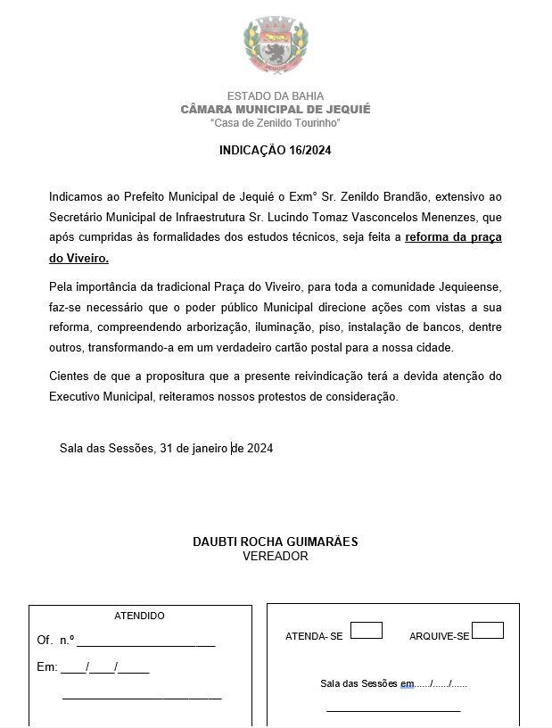 O Vereador Colorido, Daubti Rocha Guimaraes (PP), líder do Governo Zé Cocá na Câmara, protocolou com data de 31 de janeiro de 2024, a solicitação dirigida ao Prefeito Municipal de Jequié, extensivo ao Secretário Municipal de Infraestrutura, que após cumpridas às formalidades dos estudos técnicos, seja feita a reforma da Praça do Viveiro.