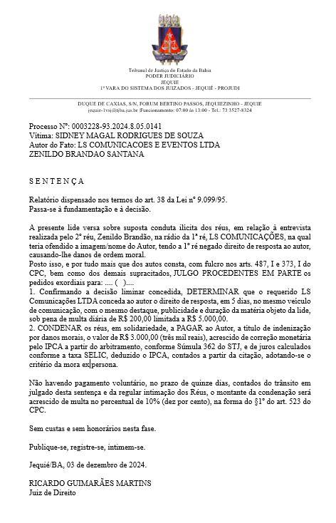 O juiz titular da 1ª Vara do Sistema dos Juizados do Comarca de Jequié, condenou o prefeito de Jequié, Zé Cocá (PP), a pagar ao ex-vereador Sidney Magal, a título de indenização por danos morais, o valor de R$ 3.000,00 (três mil reais), acrescido de correção monetária pelo IPCA a partir do arbitramento, conforme Súmula 362 do STJ, e de juros calculados conforme a taxa SELIC, deduzido o IPCA, contados a partir da citação.