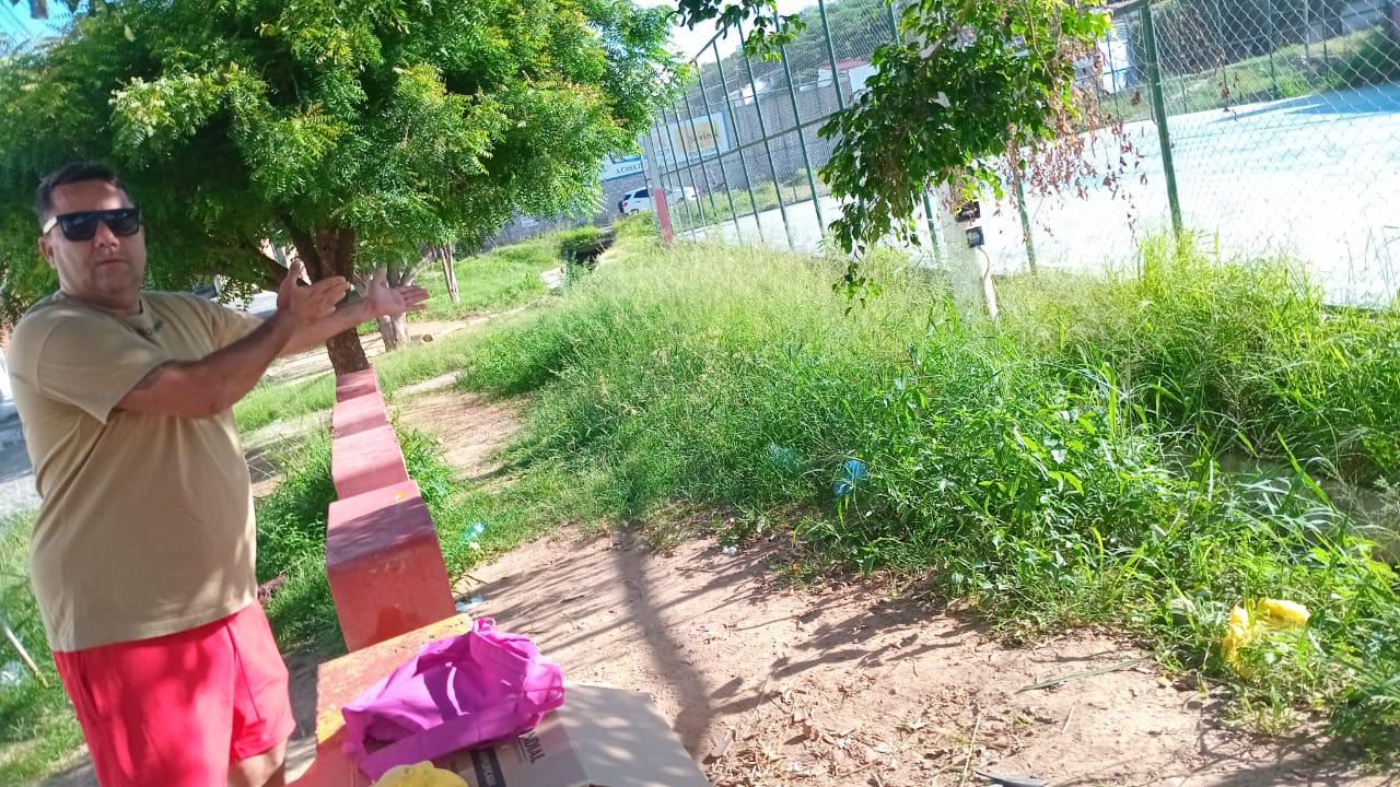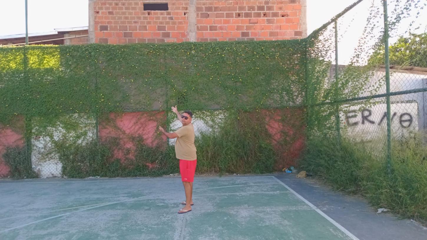 Ao lado desse imóvel, há uma quadra de esportes da comunidade e os moradores aproveitaram o momento para também mostrar a situação precária e a falta de cuidados da secretaria de serviços públicos, não só com a quadra como também com as ruas do bairro.