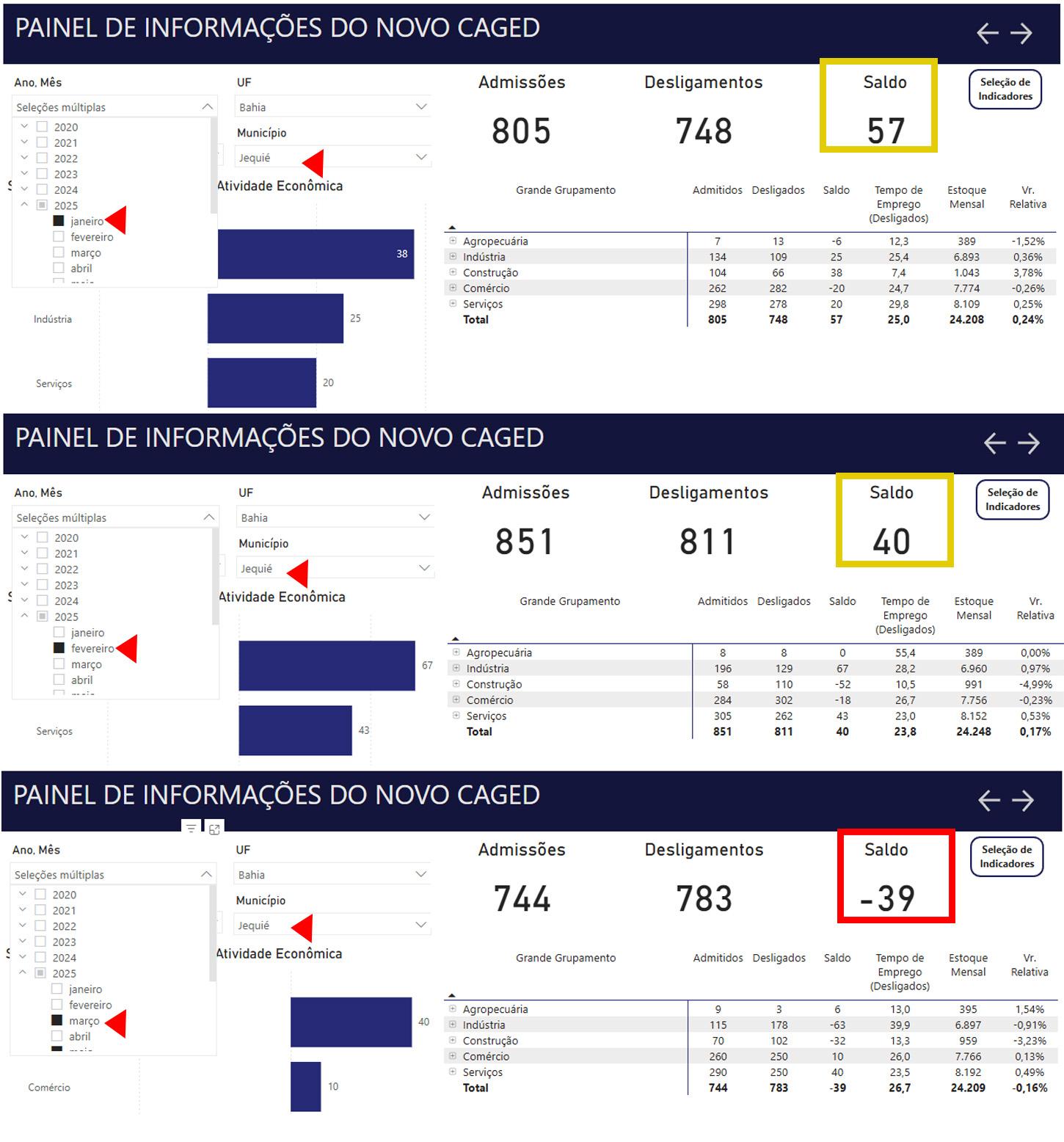 Segundo o CAGED, no mês de março desse ano, o saldo na geração de emprego em Jequié foi NEGATIVO, com apontamento para demissão de 39 trabalhadores e ZERO geração de novos postos de trabalho com carteira assinada. Dados preocupante para uma cidade de aproximadamente 160 mil habitantes, que tem apenas 24.209 trabalhadores com carteira assinada, apenas 15,13% estão empregados.