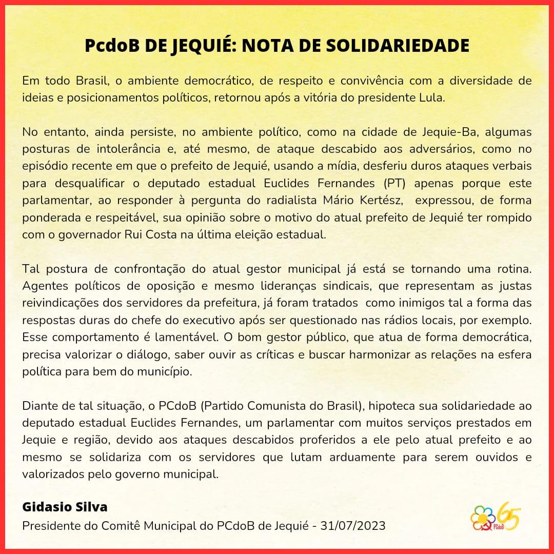 O Partido Comunista do Brasil de Jequié, também se manifestou por meio de uma nota assinada pelo Presidente Gildásio Silva, ressaltando que o ambiente democrático e de respeito a diversidade de pensamento e posicionamentos políticos retornou ao Brasil após a eleição do Presidente Lula (PT), mas que em Jequié ainda persistem posturas de intolerância e ataques descabidos aos adversários, por parte do atual Prefeito de Jequié. Ainda na nota, Gildásio destaca a história política do Deputado Estadual Euclides Fernandes, com muitos serviços prestado a Jequié e toda a Região.