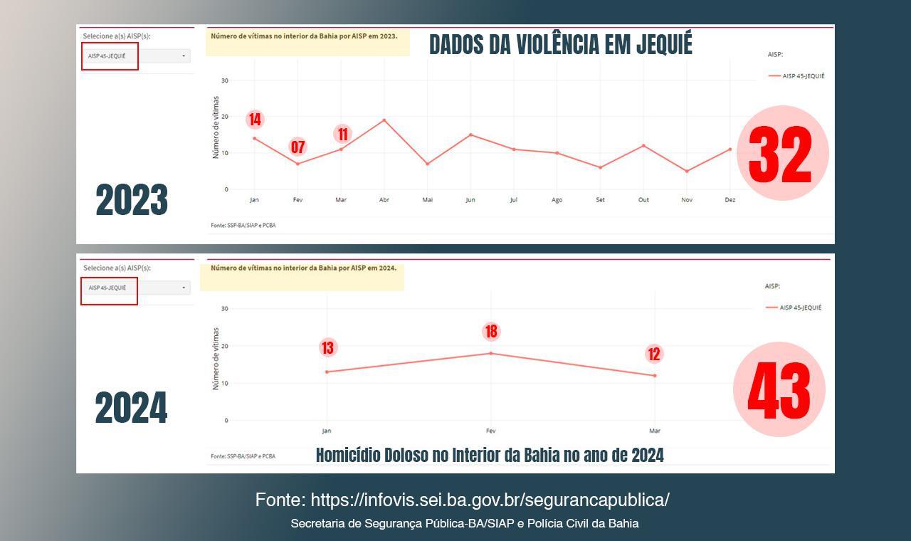 Afamada de cidade mais violenta do Brasil em 2022, Jequié vem pagando caro por uma situação que não transparece a completa realidade, mesmo havendo notificação da Secretaria de Segurança Pública da Bahia para o crescimento de homicídios dolosos, que no primeiro trimeste de 2024, já somam 43, frente aos 32 do primeiro trimeste de 2023.
