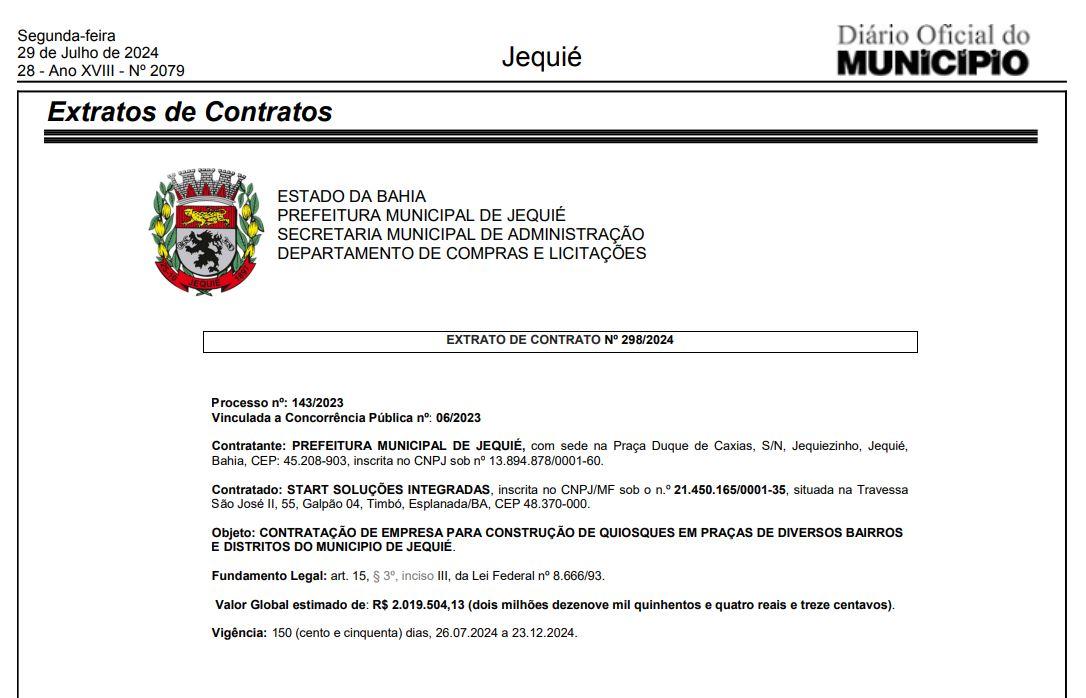 O Diário Oficial do Município de Jequié, desta segunda-feira, 29 de Julho de 2024, Nº 2079, publicou ato de Extrato de Contrato de n.º 298/2024, tendo como base o Processo nº: 143/2023, vinculada a Concorrência Pública nº: 06/2023, contratando a empresa START SOLUÇÕES INTEGRADAS, da cidade de Esplanada/BA, para construção de quiosques em praças de diversos bairros e distritos do município de Jequié, no valor de R$ 2.019.504,13 (dois milhões dezenove mil quinhentos e quatro reais e treze centavos).