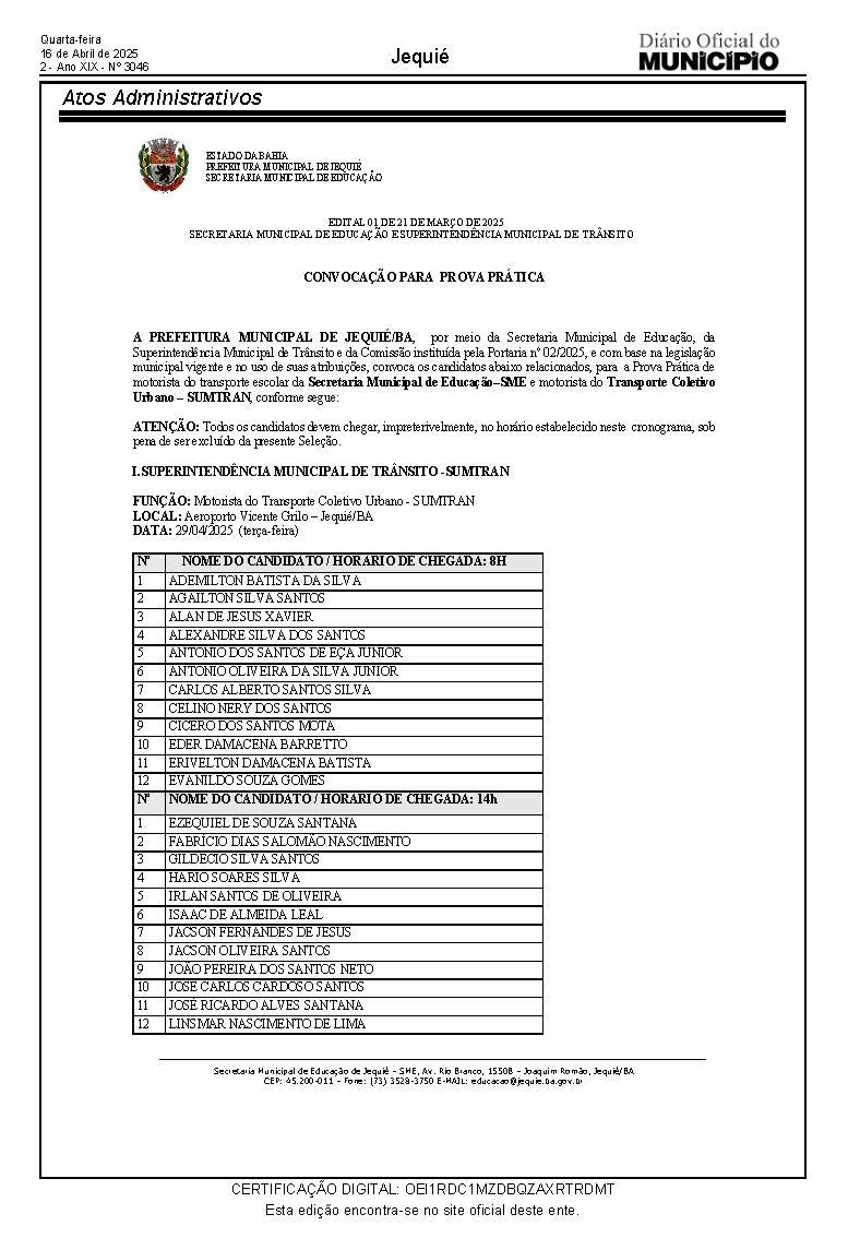 O Diário Oficial da Prefeitura de Jequié, publicou no dia 16/04, a relação dos candidatos convocados a comparecerem para prestar Prova Prática de motorista do transporte escolar da Secretaria Municipal de Educação–SME e motorista do Transporte Coletivo Urbano, sob responsabilidade da SUMTRAN.