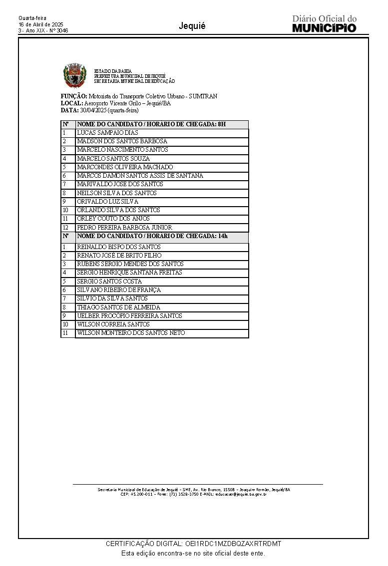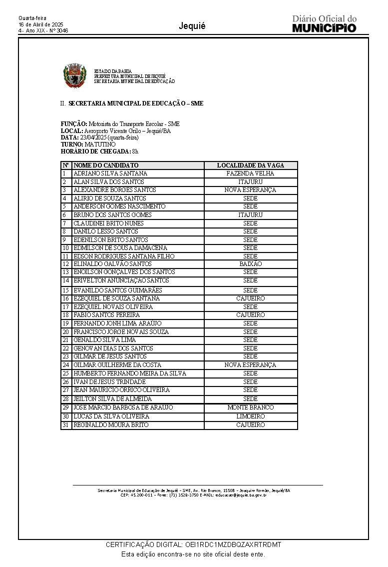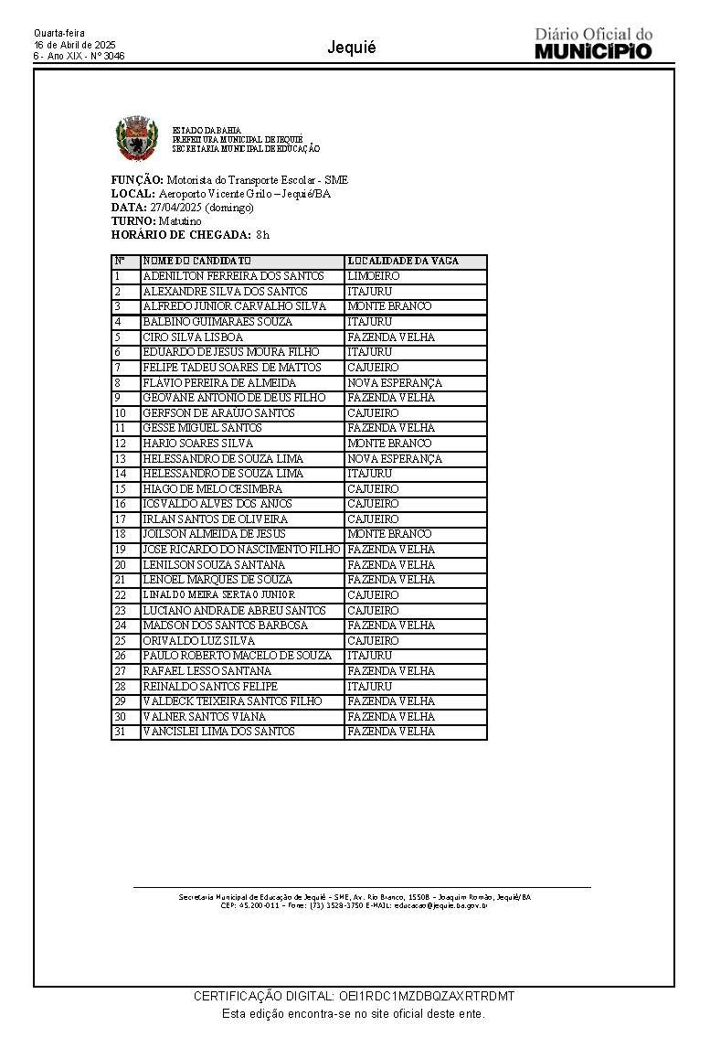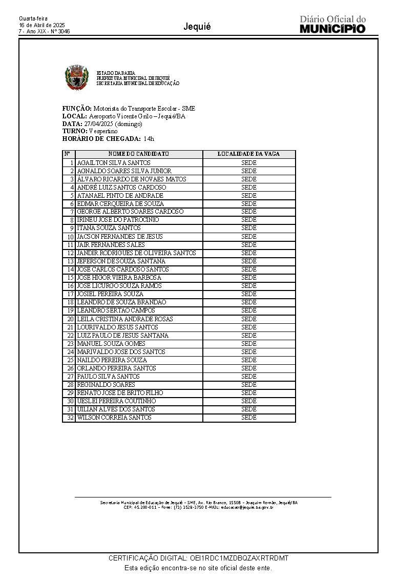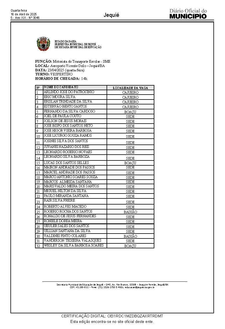 Já os candidatos para a função de Motorista do Transporte Escolar da Secretaria Municipal de Educação, devem comparecer à praça do Aeroporto Vicente Grilo munidos de documento de identificação, no dia 23/04, quarta-feira, às 8h e 14h, conforme relação abaixo, impreterivelmente as 8h.