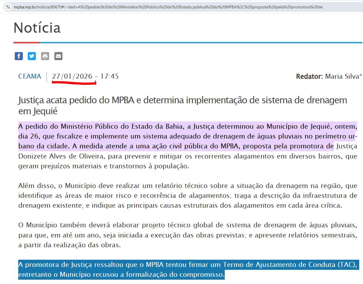 Moradores reclamaram ao MP sobre a ocorrência de inundações que atingem residências de várias localidades da cidade e os reiterados alagamentos danificam bens móveis e imóveis além de comprometer as vias e calçamentos públicos, impedindo a circulação das pessoas nas ruas. Técnicos da Central de Apoio Técnico e Pericial do MP (Ceat) realizaram perícia nas localidades denunciadas e comprovaram os problemas. Foram emitidos pareceres dando conta das “diversas bacias ocupadas irregularmente por construções realizadas com a anuência e/ou conivência do Poder Público apesar de não atenderem aos mínimos critérios ambientais”. Para agravar a situação, explicam os promotores de Justiça, Jequié não dispõe de um sistema de drenagem pluvial adequado para atender ao crescimento populacional e econômico.