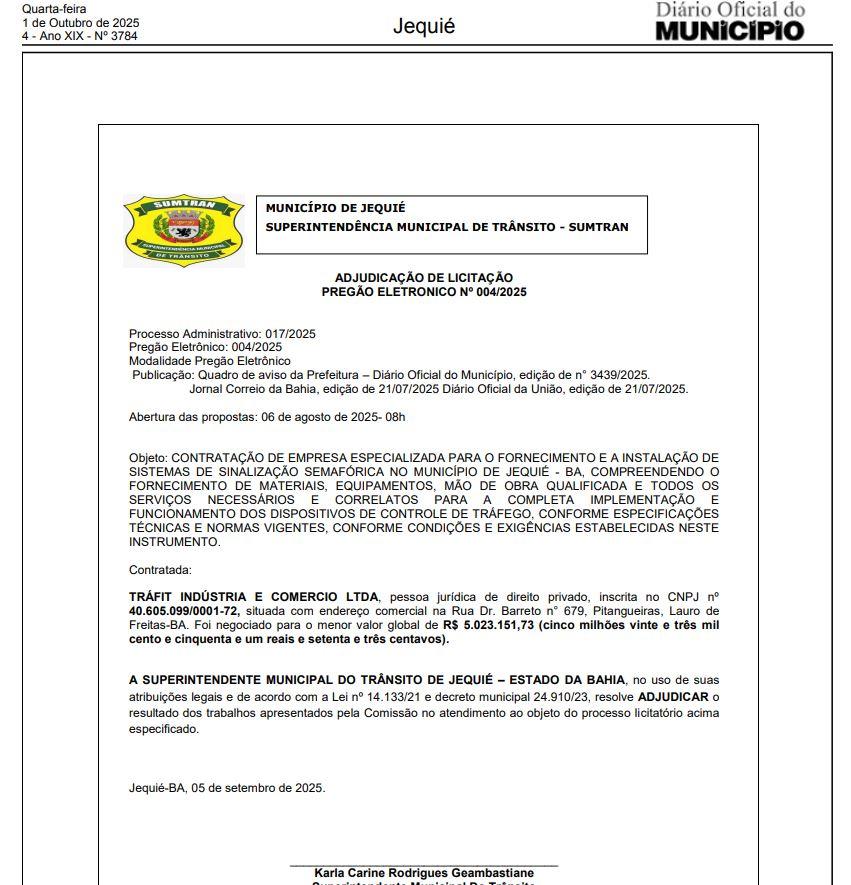 O diário oficial da prefeitura de Jequié, publicou ontem, 01/10, na edição de n.º 3784, a contratação da empresa TRÁFIT INDÚSTRIA E COMERCIO LTDA, inscrita no CNPJ nº 40.605.099/0001-72, situada na Rua Dr. Barreto n° 679, Pitangueiras, Lauro de Freitas-BA, para o fornecimento de fornecimento e instalação de sistemas de sinalização semafórica no município de Jequié.