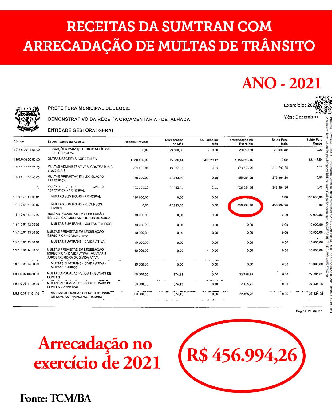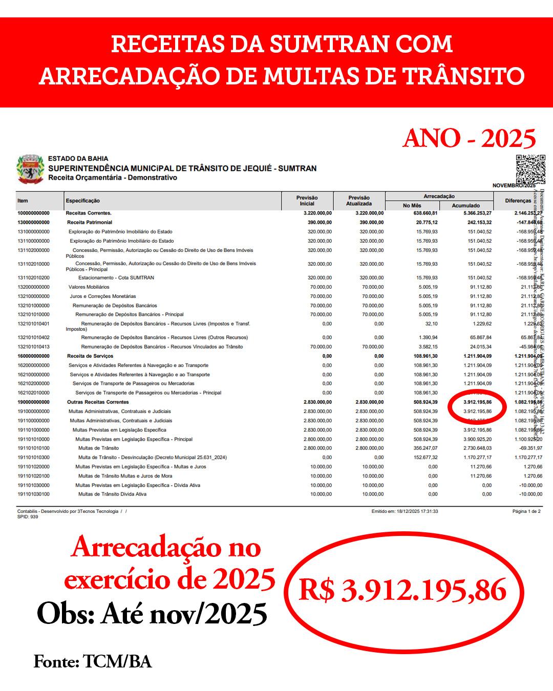 No intervalo de 2021 a 2025, a Sumtran de Jequié arrecadou exatos R$ 10.285.835,89. O valor está sendo considerado por muitos como excessivo para uma cidade de 160 mil habitantes, sendo que somente 25 mil trabalham com carteira assinada e outras 46 mil pessoas recebem auxílio do governo federal através do Bolsa Família.