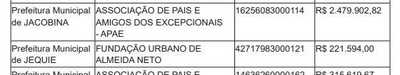 O Diário Oficial do Tribunal de Contas dos Municípios do Estado da Bahia, Edição de 21/11/2023, nº 2222, tornou público a informação que trata da falta de prestação de contas dos recursos repassados, no exercício de 2021, pela prefeitura de Jequié, referente aos repasses efetuados às entidades ASSOCIAÇÃO DE PAIS E AMIGOS DOS EXCEPCIONAIS – APAE (R$ 315.619,67) e a JEQUIE FUNDAÇÃO URBANO DE ALMEIDA NETO (R$ 221.594,00). Ambos os repasses totalizam R$ 537.213,67 (quinhentos e trinta e sete mil, duzentos e treze reais e sessenta e sete centavos).