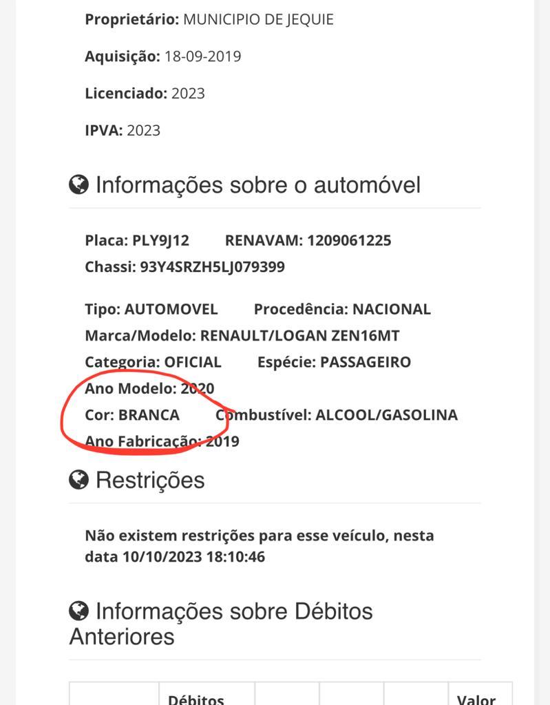 Em pesquisa superficial no órgão estadual de Trânsito é possível identificar, como exemplo, que um dos veículos utilizados pela Sumtran, de propriedade do Município de Jequié, Renavam nº 1209061225, Chassis 93Y4RSZH5LJ079399, Placa Policial PLY 9J12, Marca Renalt, Modelo Logan Zen 16mt, possui em sua documentação oficial, a predominância da COR BRANCA, diferente das características que o mesmo apresenta na condição de viatura oficial do órgão de Trânsito de Jequié, a Sumtran.