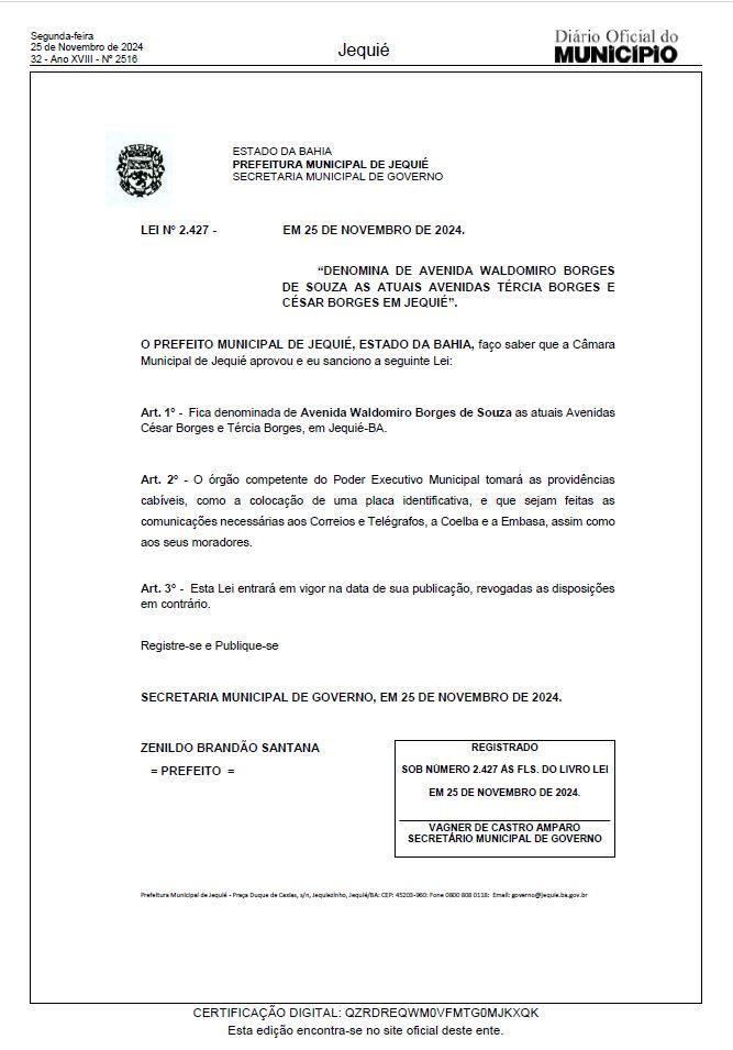 Na seção do documento, no Art. 2º, a administração municipal de Jequié se responsabiliza por adotar as medidas pertinentes, incluindo a instalação de uma placa de identificação, além de notificar os Correios e Telégrafos, a Coelba e a Embasa, assim como para seus habitantes. A legislação passou a ser válida a partir de 25 de novembro passado.